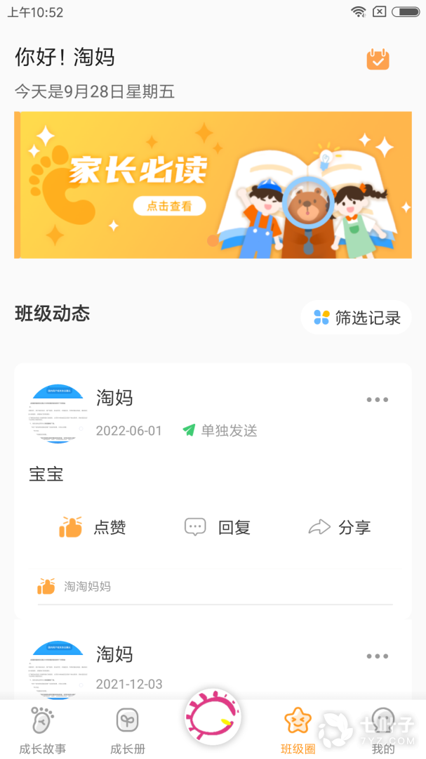 3、宝贝成长,查看其他家长发布的动态信息,进行点赞、评论、转发