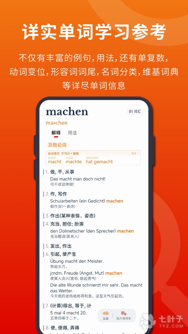 4、词汇和例句发音:德语和汉语词条、德语例句均配优质清晰发音,让你德语脱口而出