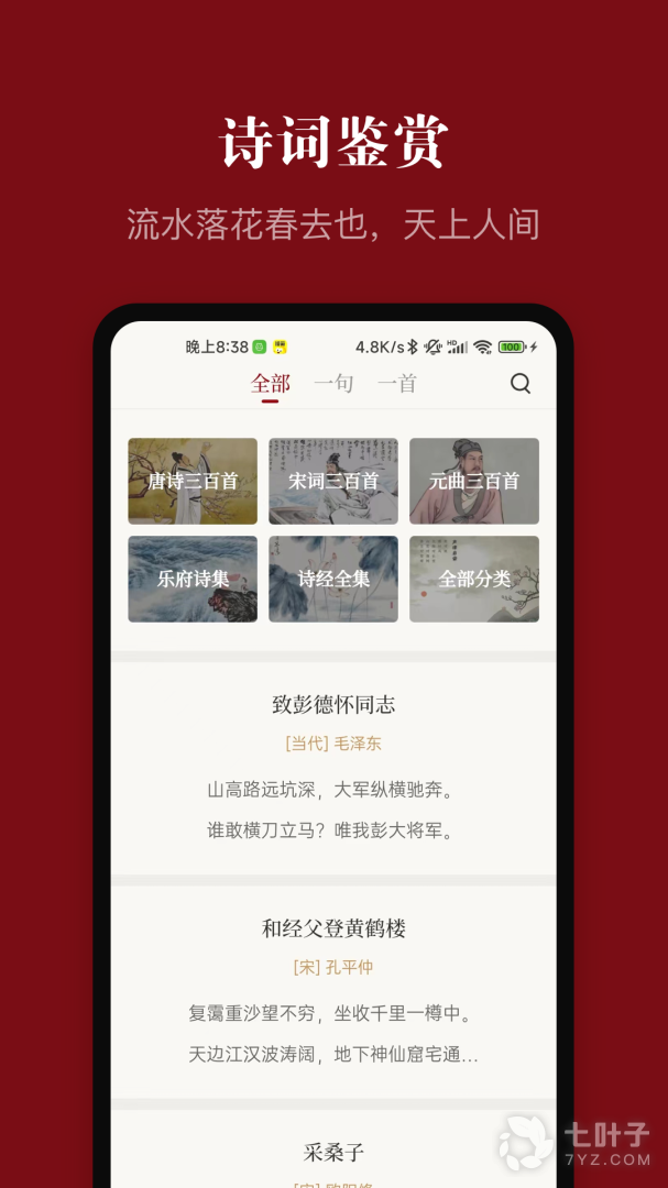 2、诗词界面可以从各种分类来了解,软件也会每天推一句、一首
