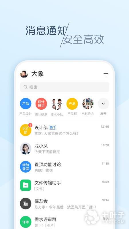 2、大象是手机上的一个企业通讯办公协作平台,拥有私有部署、数据互通、企业云盘以及信息安全四大功能特色,可以让用户随时随地的处理工作,提高效率