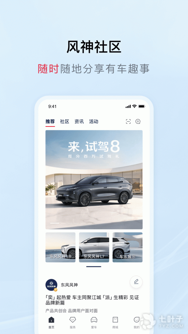 东风风神还能与其他车主客户互动聊天,发帖分享动态,体验获取积分等福利;在首页中,你可以查看最新的活动信息推送,试驾、积分活动、选车服务等一应俱全,还能发帖、点赞、回帖等等,给你不一样的汽车生活体验在选车界面中,该平台汇聚了各种车辆,其中还拥有详细的数据信息,报价、参数、配置、图片等等一网打尽;同时你可以绑定自己的爱车通过认证后就可以领券、发帖、赚积分等,更多豪礼福利等着你。