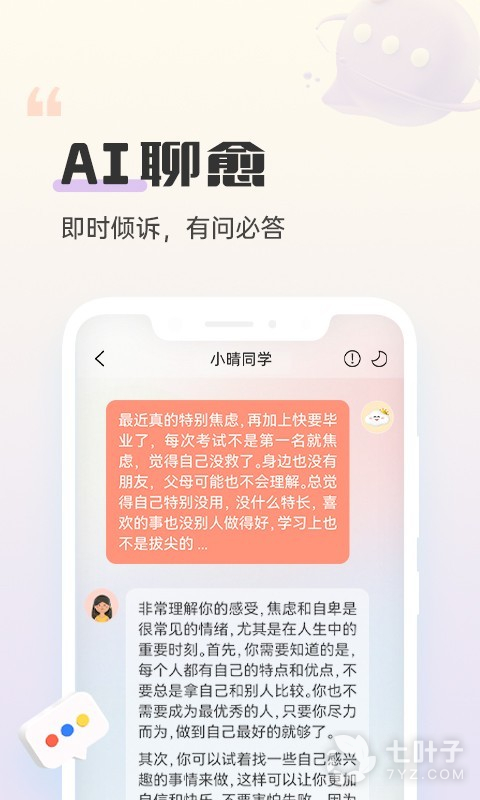 2、即时倾诉,有问必答。随时对小晴说出你的困扰吧,ta会根据你的情绪状态,为你提供调节建议和合适的“情绪处方”