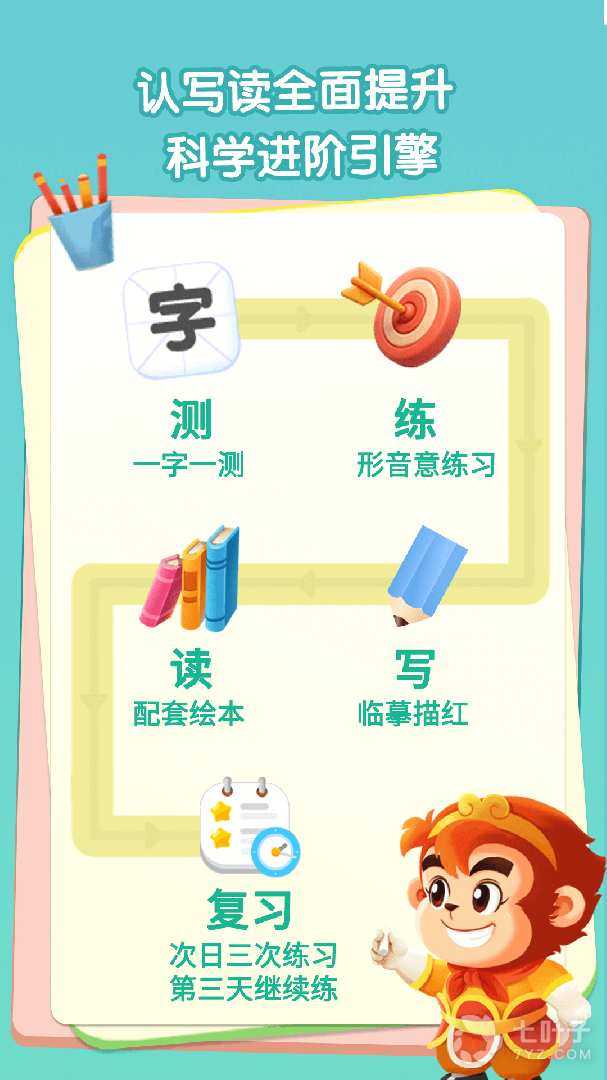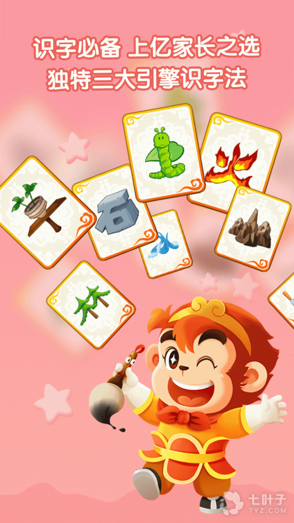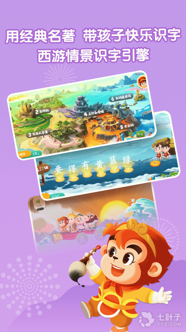 2、结合游戏的模式让孩子更加感兴趣。不单单是识字或者是,每天十几分钟的时间就能孩子学习新的汉字。将中国文化中的孙悟空作为孩子的启蒙老师,和孩子一起在游戏中认识字