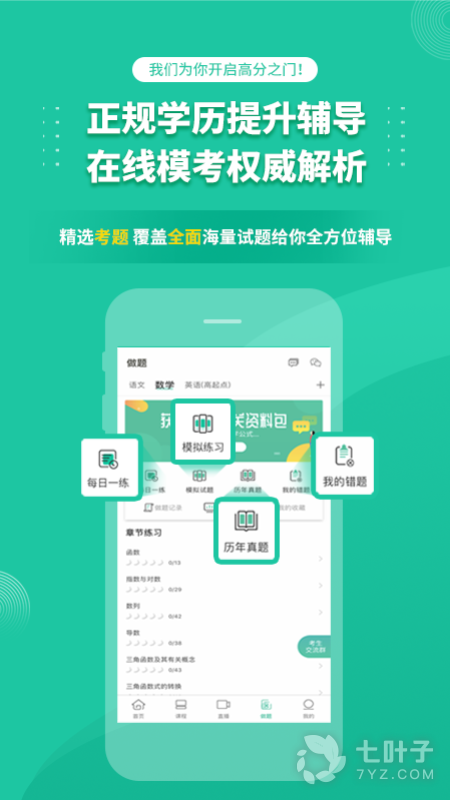 4、丰富的练习与做题模式:题库有模拟考场、历年真题练习、每日一练、快速练习、考点练习、考试押题、做题记录等多种学习与做题模式、丰富多样化的陪你一起考成人高考