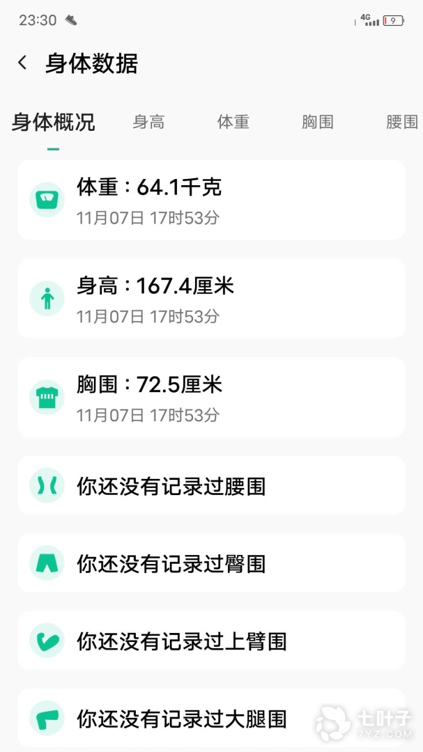 身体围度记录,记录身体多种围度,身高、体重、胸围、腰围等。