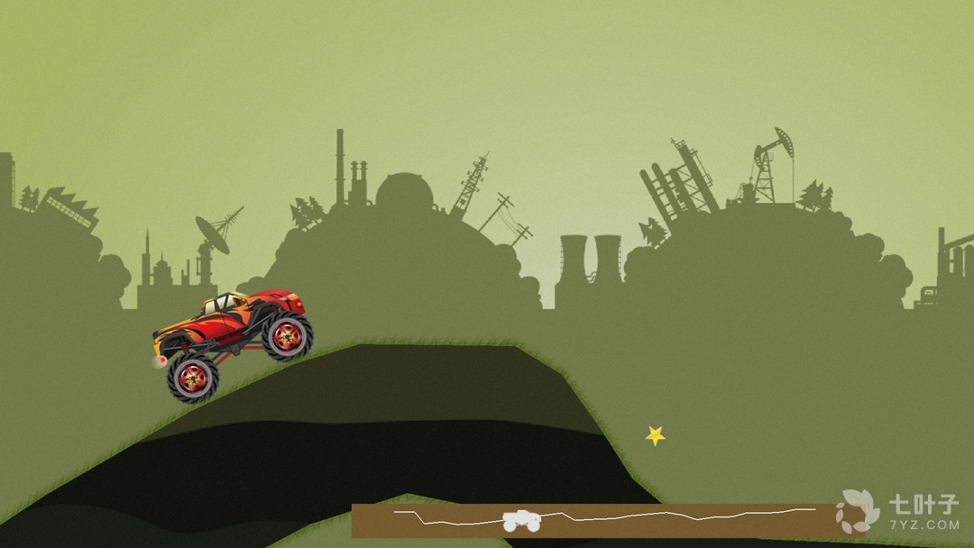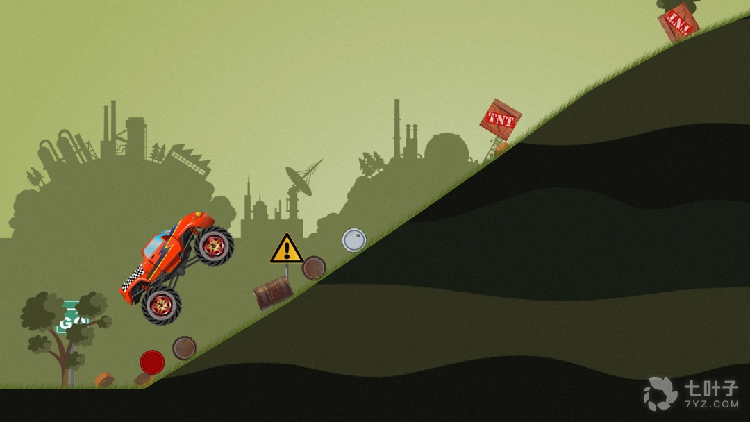 1、在车子行走过程中,路会十分不平,上下坡度也十分高,玩家在下坡时一定要注意,不要只顾着前进按钮,这是需要把握一定的平衡度,防止车翻转过来,下坡时最好按住前车胎上提,上坡则是后车胎