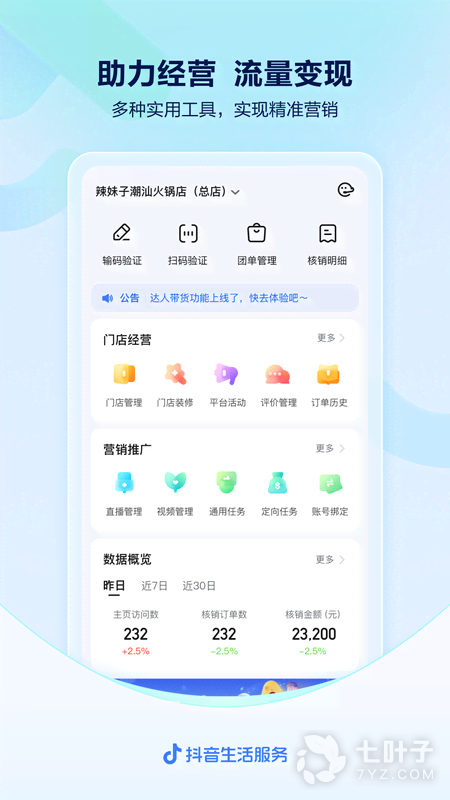 2、抖音来客是一款十分实用的商家服务平台。软件为用户提供了超多实用的商家服务,用户可以随时在线进行门店管理、营销管理、订单管理和账单管理,让用户轻松管理自家门店,开店更轻松