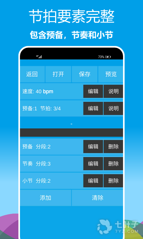 乐器节拍器是一款非常不错的学习音乐的软件,用户可以在这里进行音乐节拍的练习,帮助自己可以快速上手、调整自己的精准度,不仅有大节拍的数字显示,而且还有轻松的歌曲管理,各种的参数用户都是可以自己去设置的,十分的方便,所有的节奏全部是由自己去把握的。