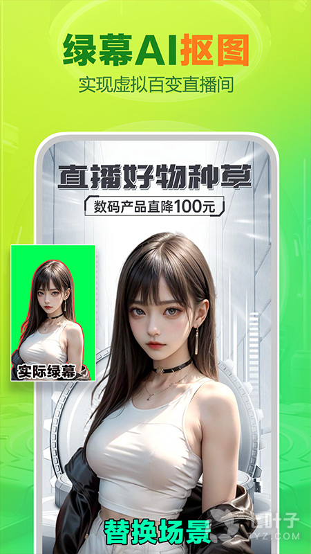 1、我们拥有发丝级的AI抠像和绿幕抠图功能,装修好直播间后,您只需站在镜头或绿色背景前,即可一键更换背景进行实时虚拟直播