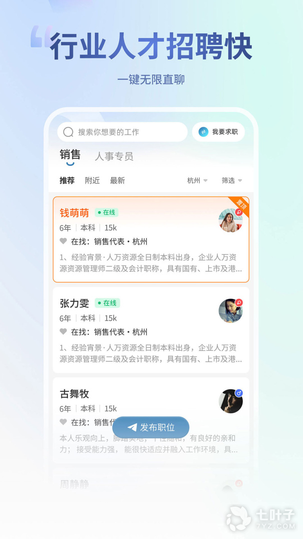 2、这里有大量真实可靠的岗位,智能推荐,为用户匹配适合的职位,在线面试,提高面试效率,还有专业客户为你贴心服务,解答你的疑惑,下载杭州直聘app,轻轻松松找工作