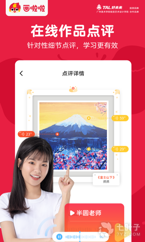 画啦啦美术课堂是一款专业学习画画的学习平台,让学生们都可以在这里获得专业的美术知识,提升孩子的美术能力,加入平台中可以了解更多的内容,减轻家长的辅导,压力,学习互动,两不误,还有专业的老师线上辅导。