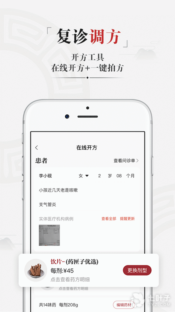 开方工具——“电子处方”:字母检索组合查询,拥有详细经方库,一键生成处方,提供高效便捷的开方体验。“拍照传方”:一键上传,拍照即成方。“开中成药”:字母检索功能优化使用流程。