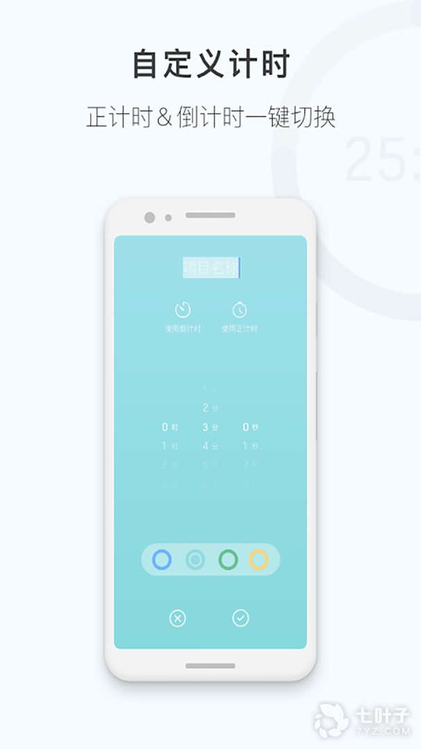 1、自定义计时正计时/倒计时一键切换,专注蓝、护眼绿、舒缓黄等多款背景皮肤颜色供您选择