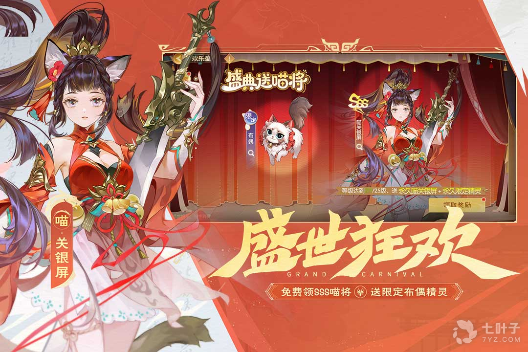 「盛典强推」——达到25级即可获得全新喵将「喵关银屏」以及永久限定精灵「布偶」!