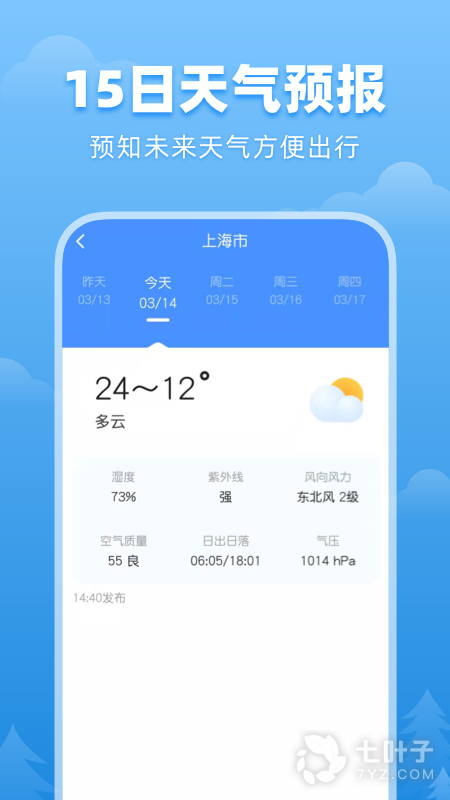 3、顺心天气为用户提供了精准的天气预报功能,可查询实时天气,还可以查询未来15天的天气情况