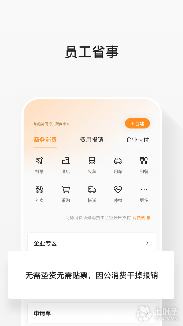 覆盖企业95%以上的因公消费场景,消费灵活;提供事前预算、事中审批、事后分析的全流程消费管控,帮企业节省成本;通过企业支付、统一发票的消费模式,帮员工告别报销。