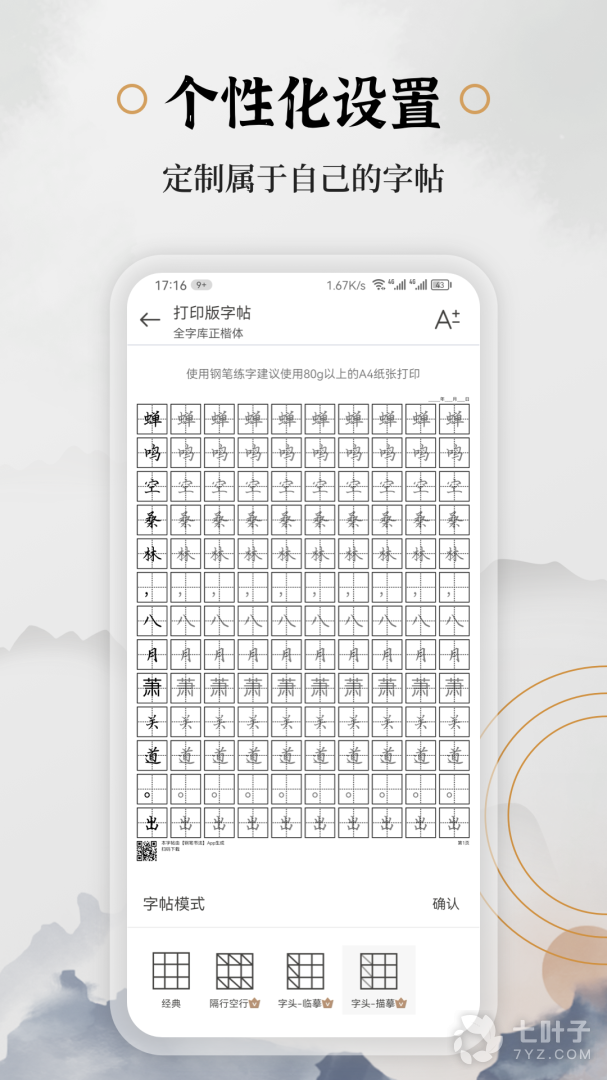 3.可生成打印版字帖:回归纸质书写,品味纸墨之美。导出字帖后可用手机连接打印机或将字帖发送到电脑用打印机打印。(建议使用A4尺寸纸张打印)