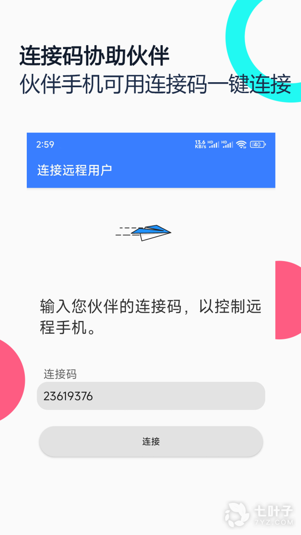4、只需要将设备连接码共享给伙伴,然后就可以远程连接手机;