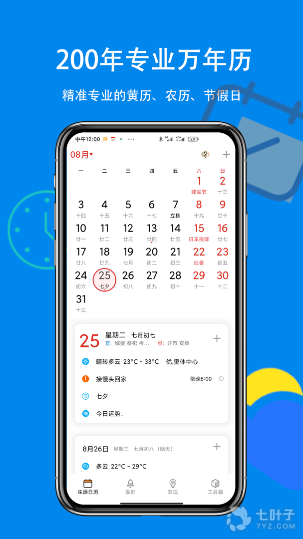 2、用来记录生活,设置提醒,不管是公历还是农历都可设置每年、每月、每周重复提醒。生日、纪念日、备忘,生活日历来帮您打理,提供公历、农历、节日、节气、黄历、法定放假、天气等查看服务,数据精准权威,用着放心