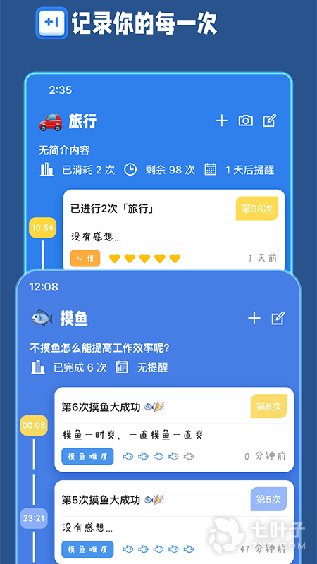 4、使用列表展示您的每回计次,轻松回顾具体办事历史,通过日志记录当时的情况与心情,可以帮助您更好的规划下一次行动