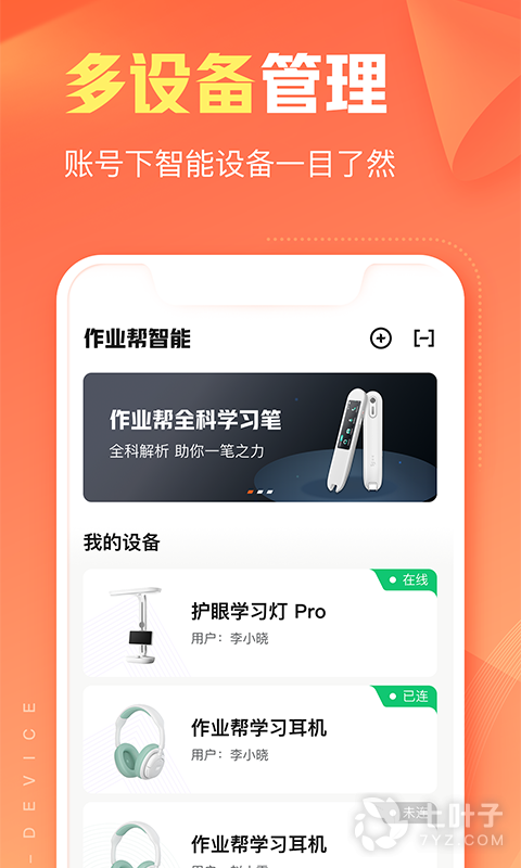 家长可以方便的通过作业帮智能App,绑定/管理作业帮全科学习笔等智能硬件设备。多台设备可接入同一个App,方便管理。