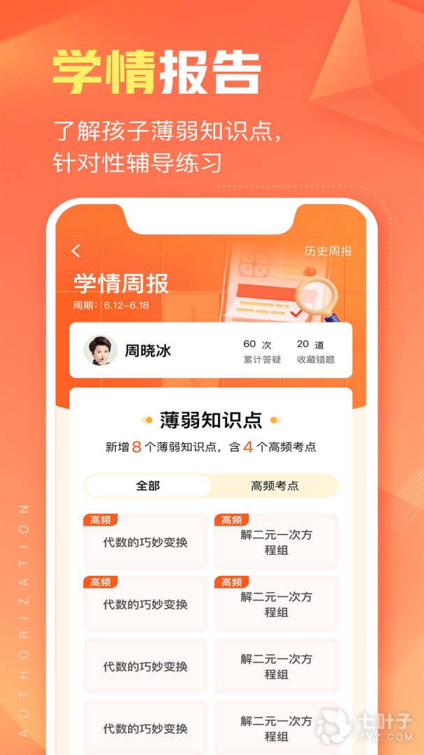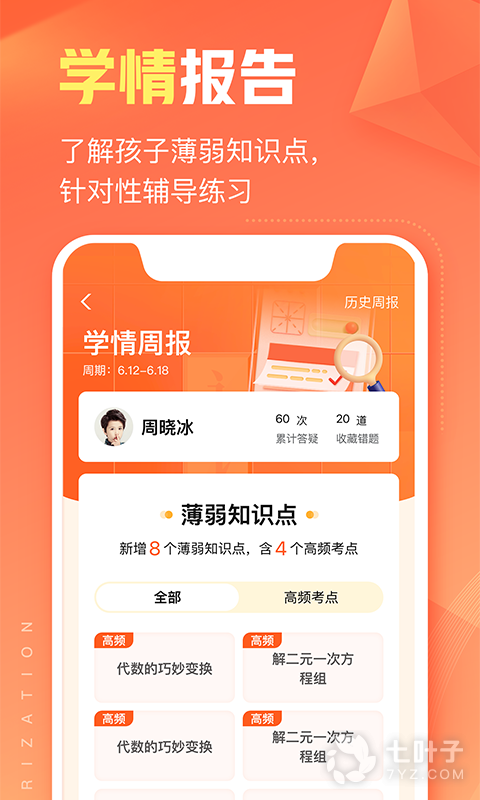 孩子的学习记录,如答疑、交作业的情况,即刻同步到App,每周生成学情报告,学习情况一目了然,更好的帮助家长了解孩子在学习中遇到的问题。
