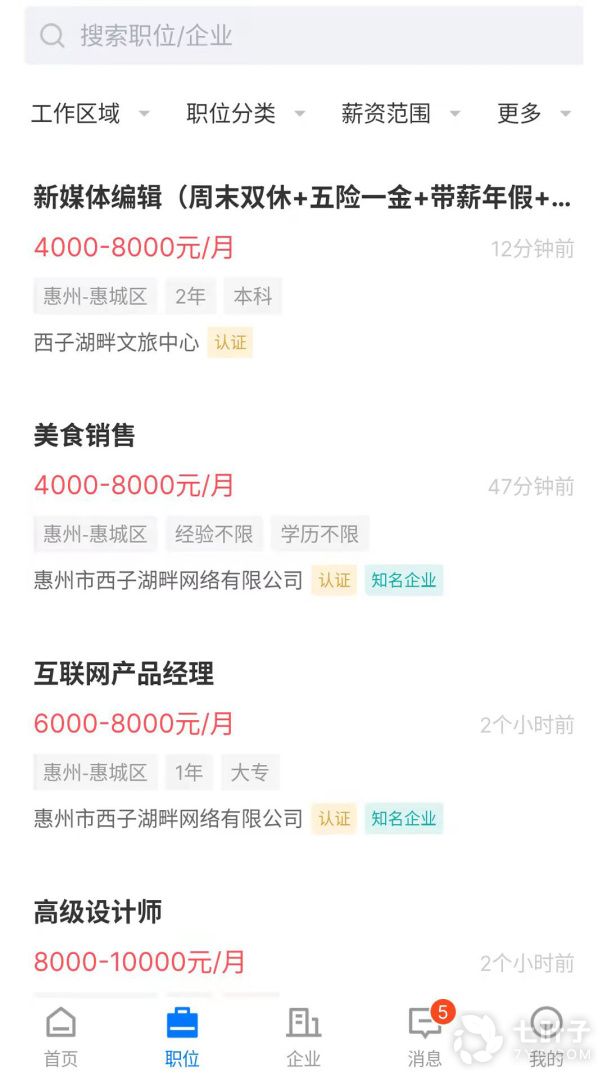 1、惠州直聘是好用的招聘软件,用户可以在上面直接搜索职位或者是企业的名称来查找,支持自定义区域以及职位分类等,操作起来很是方便,还有各种精准的职位为你推荐,让你可以更快的找到工作