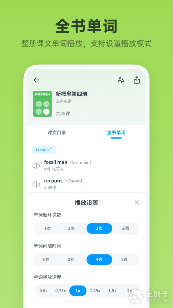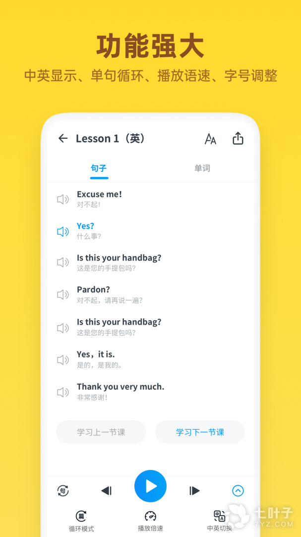 * 单句单篇精听,允许自定义播放语速、播放模式