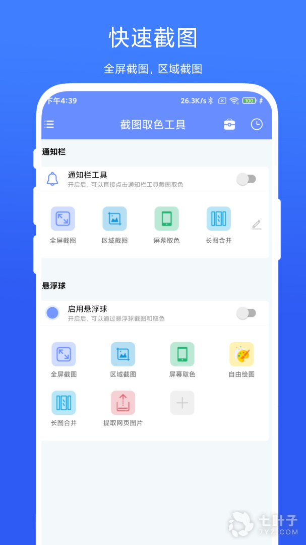 截图取色工具APP是一款功能非常丰富的快速截图取色工具,让大家随时可以使用这款就轻松的进行全屏截图及区域截图等,同时也能轻松的进行屏幕取色。包含了超多实用工具,能够满足大家的操作需要,用户们可以轻松的开启自己需要的各种功能,还可以查询截图和取色记录。