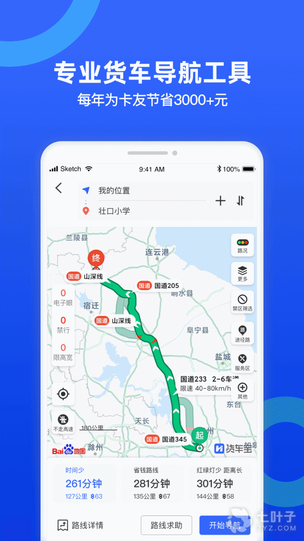 3、智能货车导航:具有特色的混合导航模式,规划更省钱的路线;智能绕行,根据大数据及即时路况反馈智能推荐省钱省时路线,不再走冤枉路