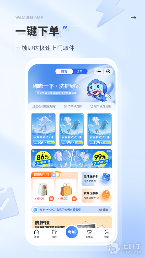- 便捷:手机一键洗衣下单,顺丰京东随时取送!