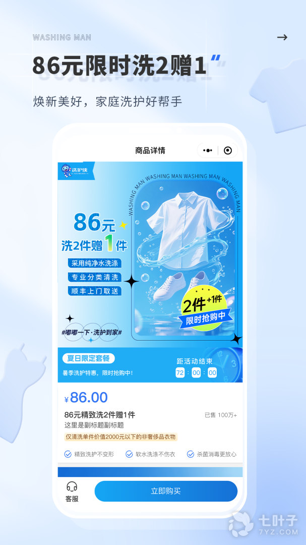 7.1 - 9.30 限时福利:99 元洗 3 件赠 2 件、86 元洗 2 件赠 1 件服务,新增床品三件套 / 四件套套餐 。
