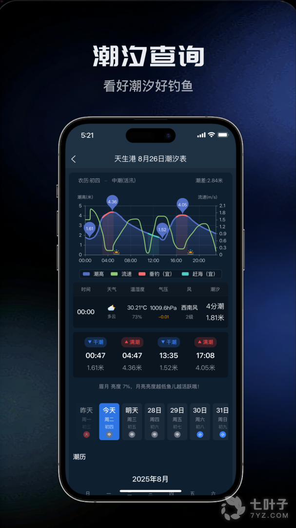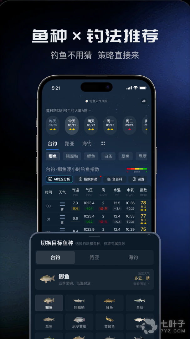 钓鱼天气预报最新版基于钓点位置的钓鱼天气查询工具,综合天气、温度、气压、湿度、风速、风向、降水、月相等相关因素的逐小时、逐天钓鱼指数查询。