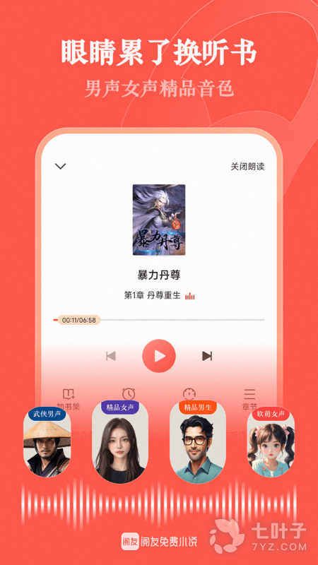 软件内的小说支持阅读和听书两种模式,听书采用AI智能朗读,支持多位不同情感与声音的“主播”选择,支持定时关闭与语速调节,听累了也可以选择文字阅读,同时还支持边听边读,内含的小说资源还支持缓存下载。
