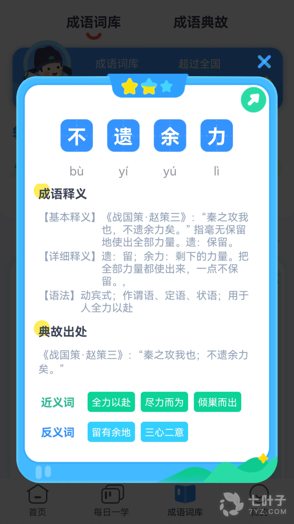 每条成语包括释义、出处、拼音、参考词、近义词、反义词等内容。并可以通过各种有趣的形式练习成语,循序渐进地提高成语的掌握程度。