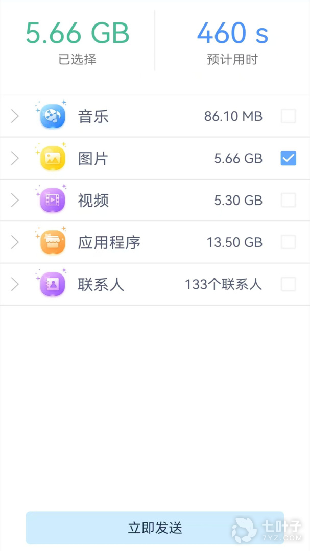 在主界面点击“我要发送”,接受者点击“我要接收”,发送者选中内容后,点击下一步,点击接受者头像即可发送出去。