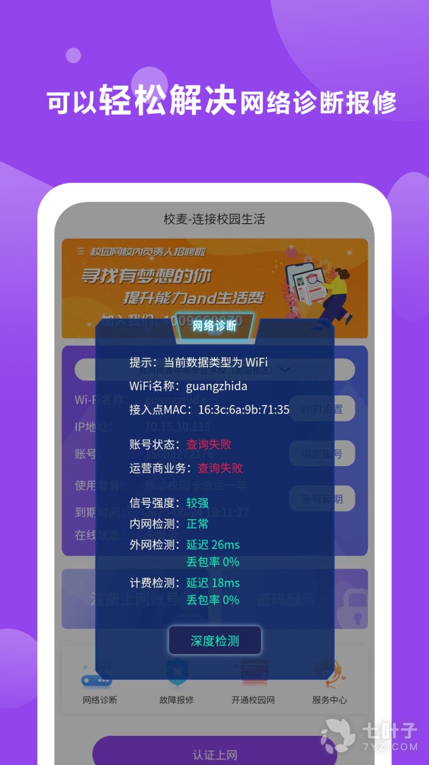2、认证方便,一键连接校园网络超级实用!学生可以实时了解校园动态,结交校园好友,丰富在校生活!校麦同时还具备自行网络诊断以及报修的功能