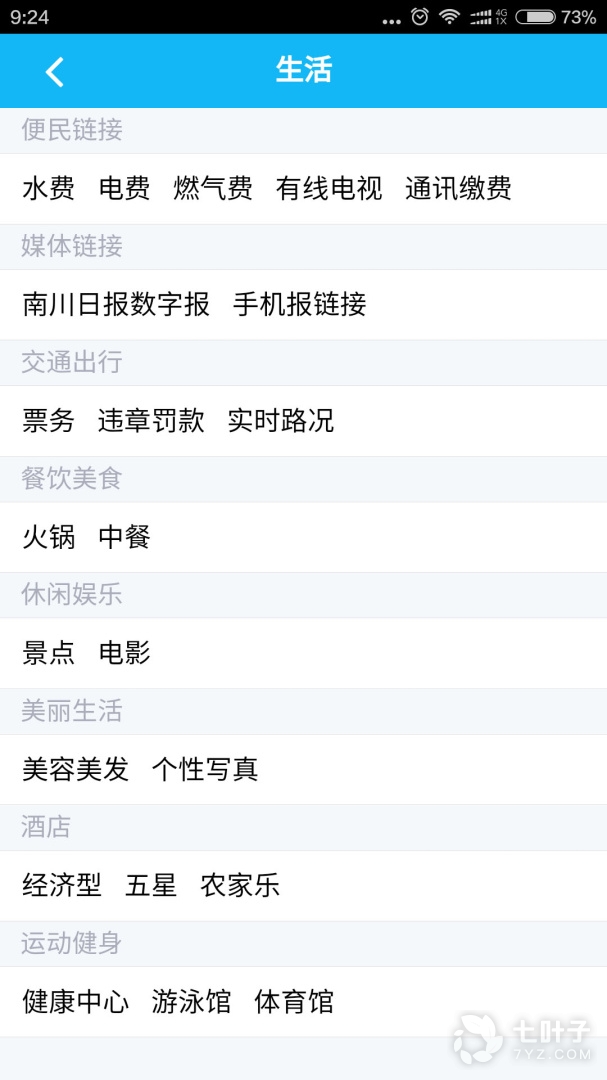 2、生活:便民链接、媒体链接、交通出行、餐饮美食、休闲娱乐、美丽生活、运动健身