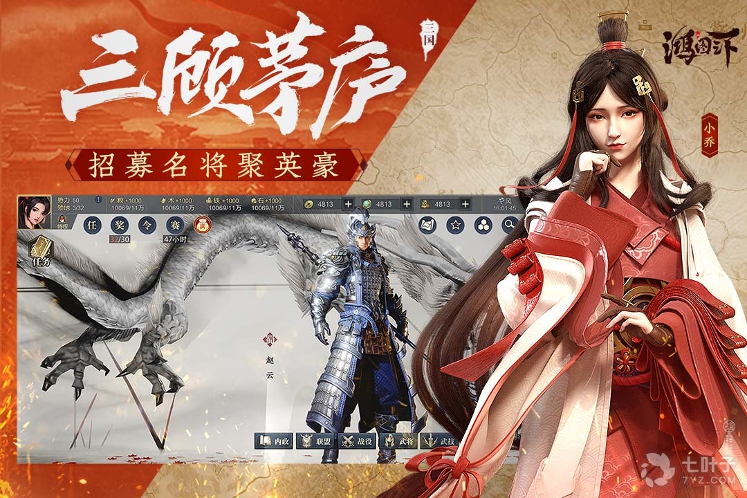3、鸿图之下最新版,游戏不用辛苦发展不用充值,鸿图之下玩家们可以直接免费使用铜币和珠玉,而且所有材料资源都是满值,直接招募将领,升级武技,打造强大的城镇,不用勾心斗角的抢资源,提心吊胆的防范,完完全全轻松享受这个三国的魅力