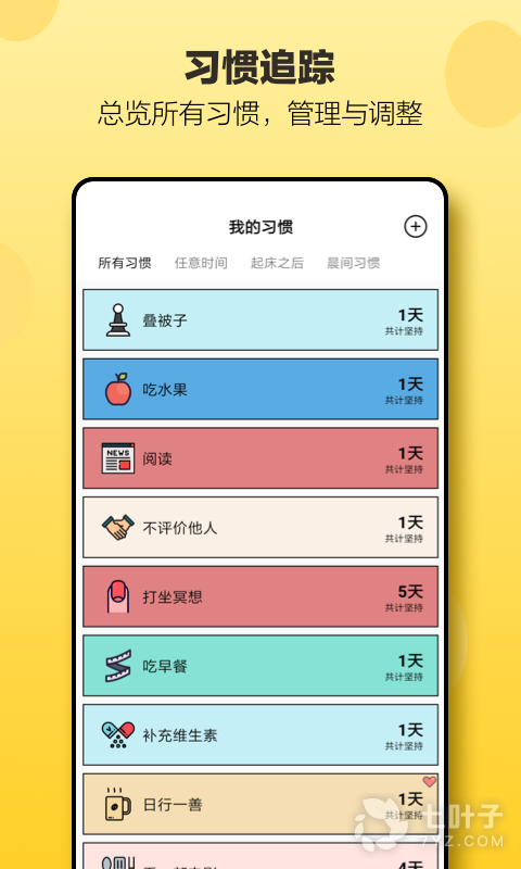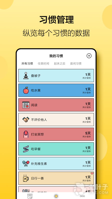 3、能够帮助用户随时添加习惯,并且进行分类管理,可以随时查看各项习惯完成情况,包含了坚持天数和目标完成情况,帮助用户纵览每个习惯数据,使用方法简单,让用户能够每日高效生活、工作和学习,使用吧