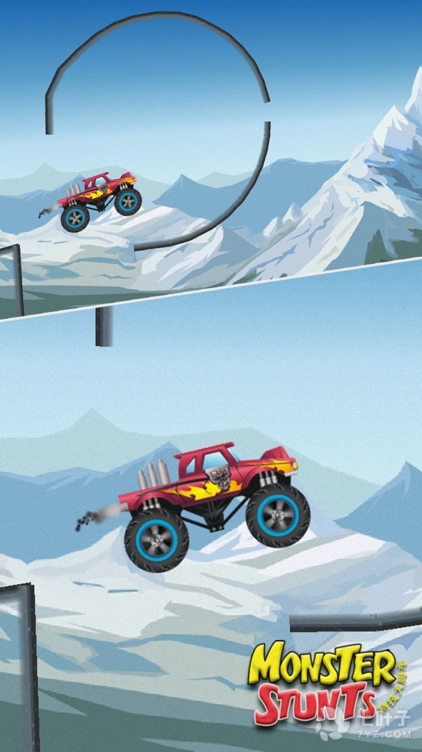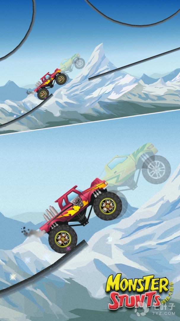 2、特技大脚车是一个美式大脚车特技竞速游戏。游戏操作简单,但是要得到高分需要技巧。玩家控制大脚车尽快的通过精心设计的道路到达终点,玩家得分越高,得到的金币也就越多
