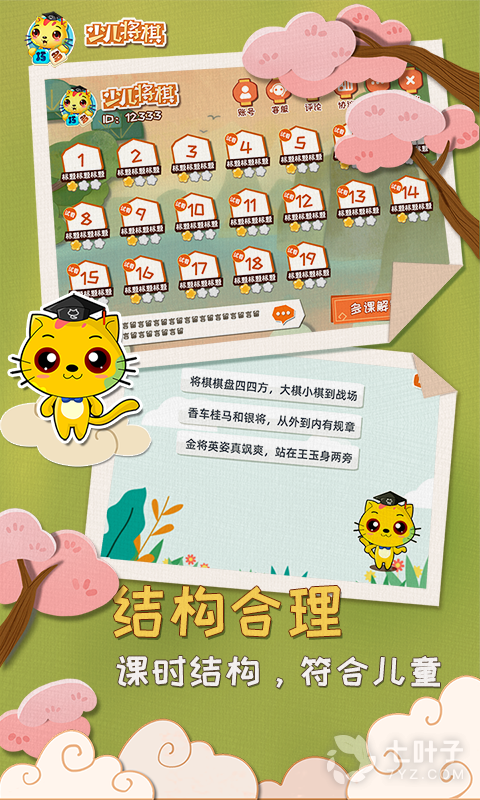 从入门到精通,结合儿童特点,课程编排控制在10分钟左右,让孩子保持良好的学习状态和兴趣,少儿教学合集app让学棋如此简单!