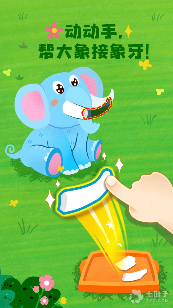 伤口医治完成,做清洁和SPA!大象想给象牙做美容,宝宝赶快用刷子刷洗,点一点象鼻,喷出水柱,冲走泡泡,真有趣!河马不爱喝水,皮肤干裂,快做个肌肤护理,再让它泡个澡吧。