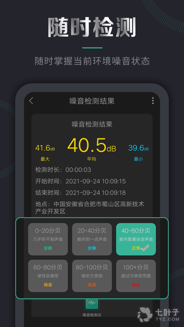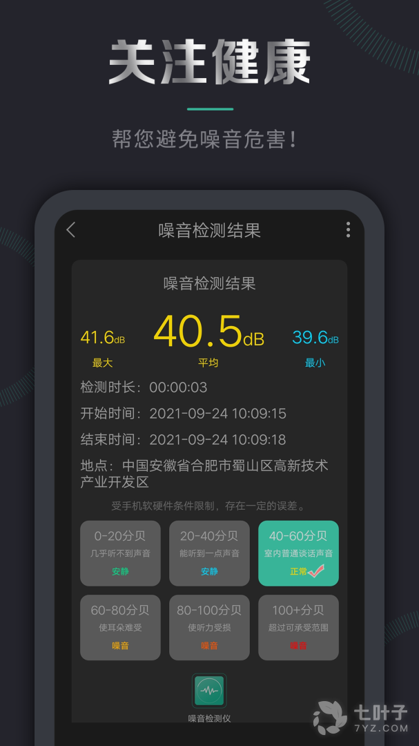 3、噪音检测仪,为大家提供了各种实用性功能,数值全面、测试准确、随时检测等等, 通过这款噪音检测仪,用户就可以去轻松检测自己周边的环境了,看看是否有噪音来进行产生,这样可以有效的来帮助自己避免掉噪音危害,不过检测结果可能因手机设备问题而有差异,所以结果仅供参考哦