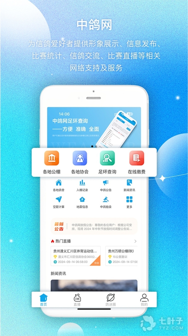 2、中鸽网App是关于鸽子赛事直播的平台,赛事开始前都会对用户进行提前通知,用户可以通过平台来了解赛鸽的相关讯息,在线观看协会直播,在线观看公棚直播,全程直播精彩一概不错过,多平台专业讲解,还便于广大群体交流探讨