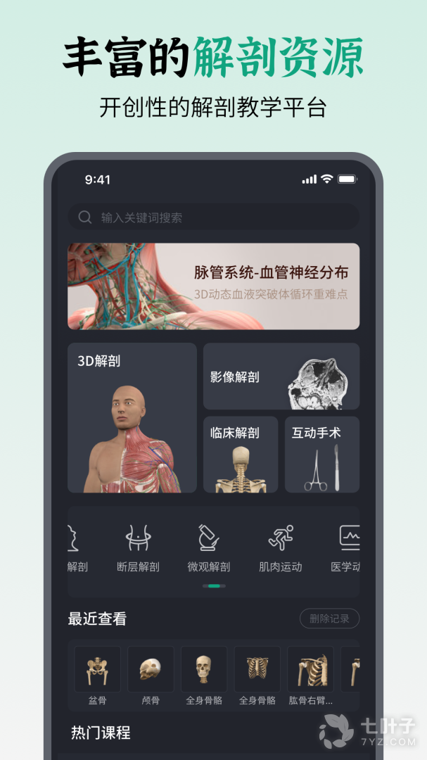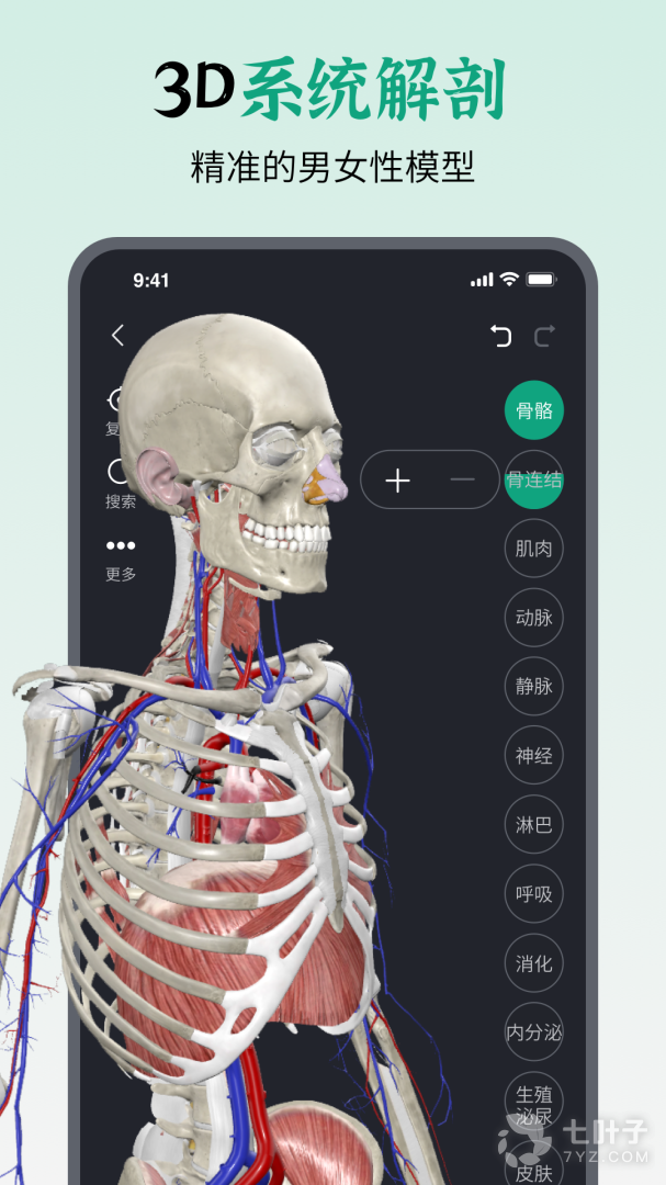 6、大量内容涵盖人体器官、神经、骨骼、肌肉、血管、淋巴、内分泌等系统,用户可以根据需要进行有针对性学习