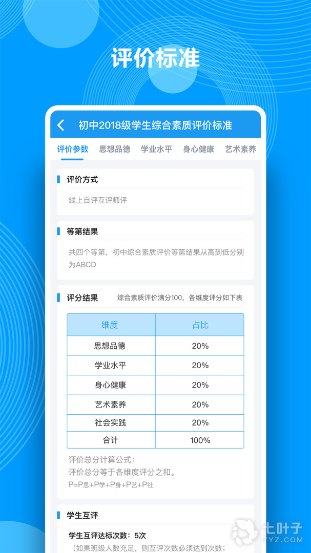 5、科学量化评价:针对不同的评价方法,产品采取了不同的科学量化策略,学生毕业时可以生成等第评价结果