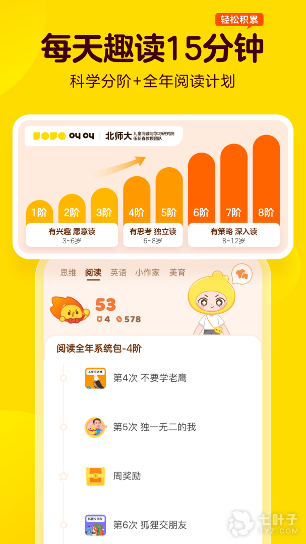学什么:叫叫阅读以学龄前儿童身心发展规律为依据,秉承叶圣陶先生的语文教育论,多读书,读好书,勤思考。带领孩子解读名篇,领略汉语文字之美,建立其知识格局,完善其独立人格,提升其语文素养。