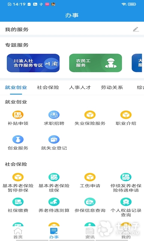 服务内容包含就业创业、社会保险、人事人才、劳动关系和综合服务等。