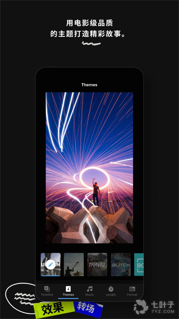 影像转换为可分享的精彩视频。选择一个主题即获得独特的效果、酷炫过渡、优美配乐。